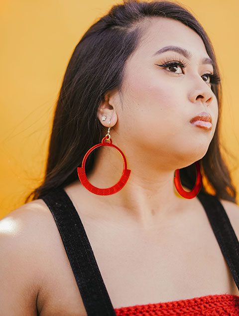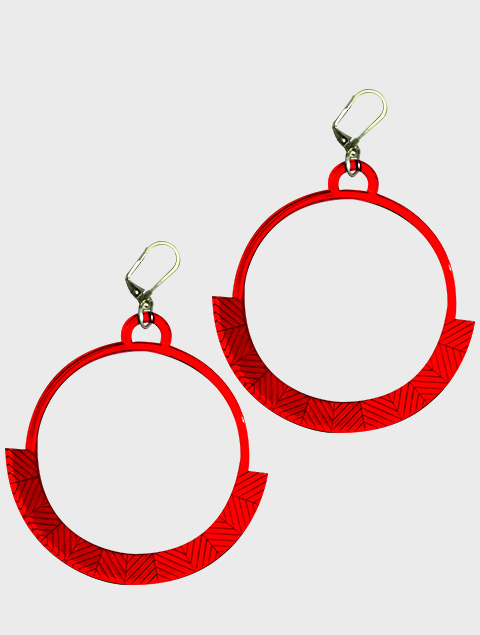 This piece comes in transparent red acrylic. The findings are gold plated brass and nickel free. The engravings are based on traditional textiles.