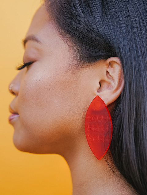 This piece comes in matte red acrylic. The findings are gold plated brass and nickel free. The engravings are based on traditional Igorot textiles.