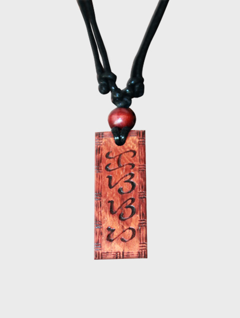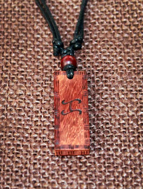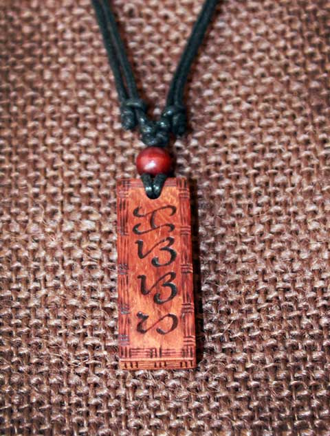 Malaya Designs Exotic wood Pendant, Baybayin “May Pagasa” and “Ka” (Adjustable) double sided handcrafted writing, approximately 5/8″ width, 1/4″ thickness, 1″ – 1 1/2″ length.